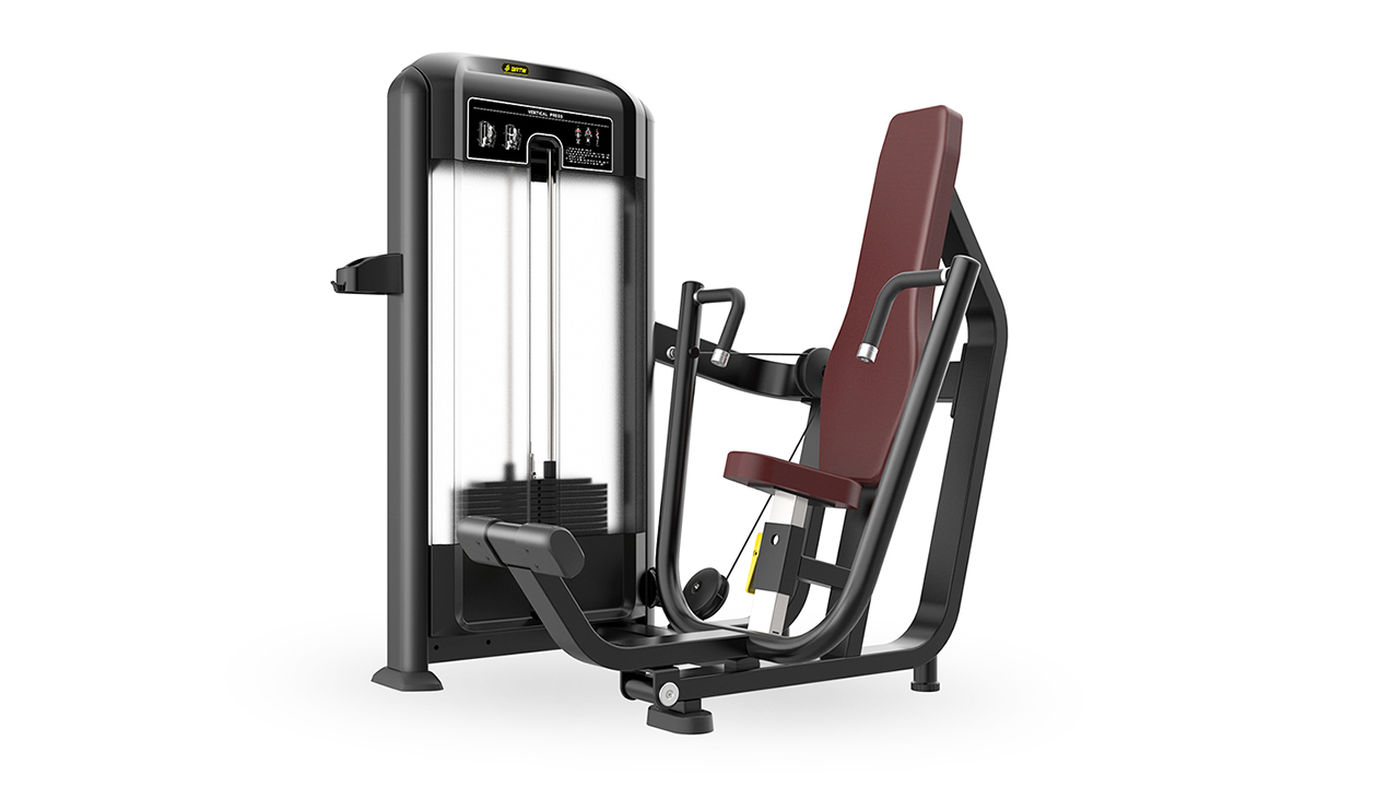 Sit on the chest pusher and choose the right weight. Keep your back close to the back of the chair, step on the ground with your feet, hold the handles with both hands, and keep your palms down. Elbows open to both sides of the body, .....